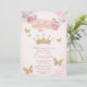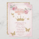 Este convite de chá de fraldas personalizado apresenta um tema da princesa de conto de fadas para uma menina em um fundo cor-de-rosa macio. Uma imagem de uma pequena princesa reluzente dourada tiara é ilustrada abaixo de um cartaz caprichoso que diz, "é uma menina". Um quadro reluzente dourado borda o convite, com rosas cor-de-rosa e buquês de respiração do bebê impressos nos cantos superior esquerdo e inferior direito da faixa. As borboletas de ouro bonito estão fluindo em torno da área de texto.