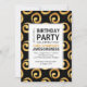 Um convite de aniversário moderno com ouro se movimenta sobre um fundo preto. O texto foi arranjado em bloco para impacto. Insira os detalhes de sua parte e o nome da honraria no lugar do texto de exemplo mostrado.