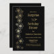 Um elegante convite de festas de 50 anos de janto surpresa negra com spray de flores douradas.