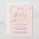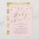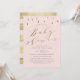 Design de convite a chá de fraldas cor-de-rosa, moderno e elegante, com gotas de chuva e caligrafia de folha de ouro. Lado de trás com listras de ouro.