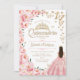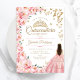 O convite para comemoração da Quinceanera, floral cor-de-rosa-claro. Possui uma garota morena em vestidos de vestido de bola, fonte de script, borboletas douradas, rosas rosa pinceladas e tiara. Perfeito para uma elegante celebração de glam estilo princesa. Personalize com seus próprios detalhes. Impressos convites Zazzle ou modelo de impressão digital instantânea para download.