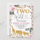 Dourado Boho Floral Safari Dois Convite para segundos aniversários Selvagens Impressão floral branca dois convites de aniversário selvagens com alguns arranjos florais cor-de-rosa com erva-pampas, algumas silhuetas de animal safari com brilho dourado e um padrão de impressão de pelagem animal marrom. Este convite de aniversário selvagem de safari é uma maneira fofa de convidar convidados para um boho inspirado em duas festas de aniversário de safari selvagem.