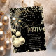 Um convite elegante para festas de férias com bolas de Natal douradas, ramificação de pinheiros, luzes de cordas e estrelas em fundo preto. Estes belos convites de Natal são perfeitos para convites de festas de janto de Natal, convites para troca de presentes de Natal, angariadores de fundos de Natal, convites para bolas de férias e outros eventos realizados durante o mês de dezembro. Use apenas os campos modelo para adicionar suas próprias informações de evento.