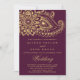 Este cartão de convite de casamento paisley de ouro é perfeito para um casamento elegante. O design mehndi apresenta um adorável hena mandala floral e motif paisley em um fundo burgundy. Nota: Este design não apresenta folha de ouro real. É um gráfico de alta qualidade feito para se parecer com folhas de ouro.