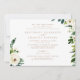 Convite para casamento branco moderno. Ambos os Conjuntos de Pais listados. Fonte mista. Dourado texto. Folhagem branca e floral.