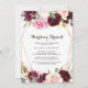 Este convite de brunch floral de burgundy dourada é perfeito para uma família simples e amigos no dia seguinte ao casamento. O design apresenta buquês de flores elegantes, verdes, esbranquiçados, roxos, vermelhos e burlões desenhados à mão, adorando quadros geométricos dourados, classe inspiradora e beleza.