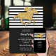 Os convites de festas do dia Derby apresentam um falso cavalo de corrida dourado e jóquei em listras brancas e pretas na parte superior e preta na parte inferior para sua festa em letra chic. CORRESPONDENTE a itens na nossa coleção.