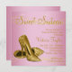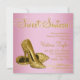 Bonito, rosa e calçado de salto alto, de ouro, doce dezesseis convites de aniversário com elegante brilho dourado, calçados de salto alto num fundo bonito rosa. Este elegante convite de festas rosa e dourado e doce dezesseis é facilmente personalizado para o seu evento adicionando detalhes do evento, estilo de fonte, tamanho de fonte e cor e texto. Este é um design impresso sem brilho real, etc.