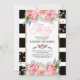 Convites de festas aniversário de 30 anos personalizados com listras pretas e brancas e lindas flores cor-de-água rosa - peões e decor de confete dourado.