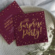 Celebre seu dia especial com este modelo na moda moderno convite de aniversário surpresa. Este design apresenta caligrafia texturizada de ouro cônico e confete em um fundo vermelho burgundy. Você pode personalizar o texto para qualquer aniversário ou evento. (21rua, 30, 40º, 50º, 60º, 70, 80, 90, 100º)