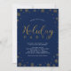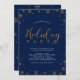 Comemore a temporada com este convite de festas de Férias. Este design apresenta flocos de neve na moda e tipografia em falso brilho dourado sobre fundo de marinho. Este design de convite será perfeito para uma festa moderna de janto de feriados ou festas corporativas.