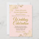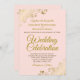 Este belo convite de casamento é na moda, simples e elegante. Ele apresenta letras douradas em um fundo cor-de-rosa pincelado pálido com filtro de folha de papel floral em cada canto. A design subestimada é compensada pelas ampolas e espirais do trabalho de arte. A parte traseira tem um código QR personalizável e uma nota de detalhes para que você possa direcionar seus convidados para um site para informações e RSVP.