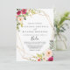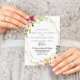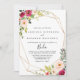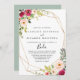 Este convite de casamento floral floral de ouro é perfeito para um casamento simples. O design apresenta belas pinturas, pintadas à mão, lindas colmeias rosa, pinceladas e amarelas com folhagem verde, enfeitando um quadro geométrico dourado.