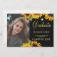 Cartão de anúncio de graduação elegante floral com buquês de girassol e um falso script de tipografia quic em ouro sobre um fundo preto sólido (cor variável).++++++ Fácil de personalizar com seu nome, escola e classe, seu texto personalizado e duas fotos em ambos os lados! ++++++++ Se quiser que ele apareça em qualquer outra cor específica, entre em contato com o designer através do botão MENSAGE abaixo.