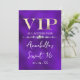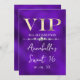 Este convite de festa personalizado apresenta um design VIP glamouroso em um fundo de textura roxa. O título VIP é impresso em uma fonte estilo folha de ouro, seguido pelo título do evento. Uma faixa de diamantes separa o texto. O local e horário da festa ou evento são impressos no verso. É perfeito para uma festa de aniversário, sweet 16, chá de noiva ou outra celebração elegante.