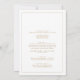 Este ouro minimalista em um convite de casamento é perfeito para um casamento simples. A design romântica moderna apresenta ouro clássico e tipografia branca emparelhada com uma caligrafia rústica, mas elegante, com estilo voltado para a mão. Personalizável em qualquer cor. Mantenha o design simples e elegante, como está, ou personalize-o adicionando seus próprios gráficos e trabalhos de arte. Salve o papel, incluindo os detalhes na parte traseira do convite de casamento, em vez de em um cartão de cercado separado. Inclua as informações de RSVP também se seu convidado estiver respondendo eletronicamente (opcional).