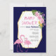 Polígono de folha de ouro, flamingos e flores tropicais marinho convite para chá de menina azul. Apresenta flamingos cor-de-rosa, flores tropicais e folhas. O texto está em branco com uma estrutura de polígono de folha de ouro sobre fundo azul nave. No verso há um padrão listrado com listras marinho azul e branca.