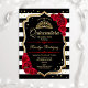Ouro branco preto e convite para comemoração vermelho de Quinceanera. Apresenta faixas pretas e brancas, fontes de script, rosas vermelhas, princesa tiara e confetti. Design clássico com ouro falso brilhante. Perfeito para uma elegante celebração de glam.