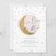 Um convite bonito e chá de fraldas com lua de ouro e estrelas com sombra de aquarela pastel macia sobre fundo branco limpo.