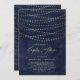 Luzes Douradas de cordas reviradas Marinho Casais azuis Convite para Chá. Convite personalizável para chá de casais com marinho de aquarela fundo azul com luzes de cadeia de brilho dourado e script elegante. Este convite será perfeito para chás e eventos ao ar livre e noturno.