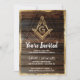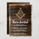 Dourados convites para mansões de madeira rústica que seriam perfeitos para a instalação anual de oficiais ou outra festa especial de festas de festas! Esses cartões masônicos personalizados são projetados em um modelo que é fácil de personalizar com suas próprias informações, tanto na frente quanto no verso. A ilustração retrata uma textura rústica de madeira com um quadrado queimado de madeira e símbolo de bússola de freemasonry e uma borda de ouro rancada. Categoria: modelos de convite masônicos; ideias de festas masônicas; e cartões masônicos personalizados. Cores: madeira castanha escura, dourada escura e branca.