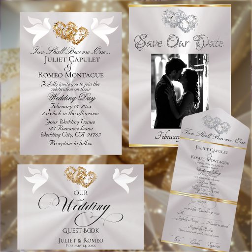 This romantic design features an elegant sage pearl background with linked hearts & doves. Details for the event in elegant script on the front and a QR code, with monogram placeholder and place for your website on the back. Available in several colors for your wedding theme colors. Designed to coordinate with the "Two Shall Become One - Silver & Gold" Wedding Collection. To change details, click «Personalize». To move the text or change the text size, font, or color click «Click to customize further»