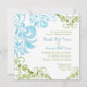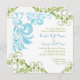 COR PALETTE: azul-aqua, azul-céu médio, verde-menta, verde-esmeralda. DESIGN COLLECTION: Este conjunto de convites para o casamento é criado de ilustrações originais sobre a cor da água de Audrey Jeanne Roberts. Delicado e moderno padrões contemporâneos de espiral de folha rolando em azul e verde ao redor do convite com um par de libélulas lindamente detalhadas. Há uma elegante fonte de caligrafia manual Ampersand com o nome da noiva e noiva e a data do casamento na frente. O verso tem as espirais pintadas manualmente que florescem o texto do convite. Este é um convite para casamento de dois lados.