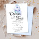 Um convite elegante, bô chic, chá para bebês, com um romântico, um apanhador de sonhos feminino pintado na moderna aquarela, uma simples tipografia e um bebê azul de volta, assim como o título "Dreams Do come True".