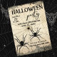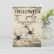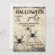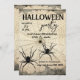 Duas aranhas pretas rastejando de sua teia de aranha em frente a uma cinza rasgada de fundo de papel, Simples e moderno, fácil de personalizar para suas festas de fantasias de Halloween assombradas. O inverso deste convite do Halloween apresenta a mesma ilustração das duas aranhas pretas e teia de aranha. Aproveite a sua festa!