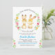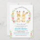 Um belo e colorido convite "Dois coelhos doces estão a caminho" para um chá de fraldas gêmeo ou borrão.