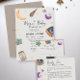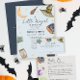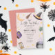 Divirta-se com um chá de fraldas de halloween com nosso adorável convite. O design apresenta ilustrações aquarelas de uma variedade de pequenos elementos bonitinhos de bruxas, juntamente com uma tipografia escrita à mão para complementar o olhar com um cabeçalho que diz "2 pequenas bruxas estão se formando". Todo texto é 100% personalizável. Projetado para chá de fraldas de meninas gêmeas.