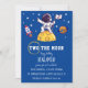 Dois a lua é um belo e original convite para o segundo aniversário do seu filho. O design moderno apresenta uma imagem de topo de um astronauta na lua sobre um fundo azul estrelado. O texto abaixo é totalmente editável através do botão "personalizar". Digite o nome e as informações da sua filha, referentes à sua festa de aniversário, para tornar este convite estelar verdadeiramente único!