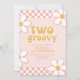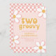 Convite de 2º aniversário Two Groovy Retro inspirado com fontes estilo anos 70 e margaridas e padrão xadrez.