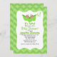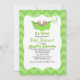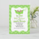 Um convite de chá de fraldas adorável e caprichoso com um fundo de chevron verde, com bebês gêmeos numa cápsula de ervilha.