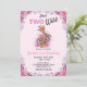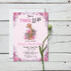 Prepare-se para uma bela festa de aniversário de safari animal para meninas com estas adoráveis criaturas florais de floresta e design de girafa. Um fundo cor-de-rosa suave é complementado por buquês florais cor-de-rosa e roxos em cada canto. "Ela é DOIS Selvagem" está escrita no topo com uma girafa doce e dois guaxinins abarrotados e cercados por flores cor-de-rosa. As costas têm um lindo padrão floral rosa. Personalize com todas as suas informações de festa de aniversário para a festa de segundo aniversário de uma garota.