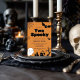 Cartão de convite de aniversário de Halloween com fotos de fantasma, aranha, morcego e velas. O título é dois assustadores."