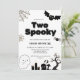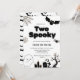 Cartão de convite de aniversário temático do Halloween com ilustrações de um fantasma, aranha, morcego e velas. O título é "Spooky One".