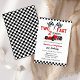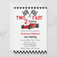 Dois carros velozes, gêmeos, segundo aniversário corrida em convites de festas de aniversários de crianças bonitinhas com uma corrida de carros vermelhos. Um tema de carro de corrida bonito para uma festa de segundo aniversário com ilustração de um carro vintage vermelho com as palavras "Crescendo muito rápido."