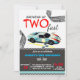 Carteira de convite de festas de criança com tema de corrida, com segundo aniversário de criança, com ilustração de um carro vintage azul com chamas. "crescendo dois rápido."