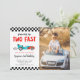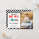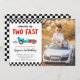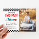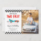 Cartão de convite para fotos de segundo aniversário de criança com tema de corrida, com ilustração de um carro vintage azul com chamas. O texto diz "crescer duas vezes rápido".