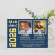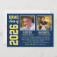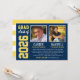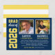 Anuncie os seus dois formandos do ensino médio da turma de 2022 com estilo com este anúncio de formatura e convite de festa. Cartão frente e verso é projetado para dois formandos e apresenta suas fotos com um design simples e masculino com letras inspiradas em camisas de times esportivos. As cores azul-marinho, amarelo e branco podem ser personalizadas para combinar com as cores da sua escola. Um padrão de listras brancas decora o verso do cartão.