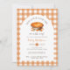 Duas Pequenas Tortas Cutis Caiam Pumpkin Gingham Chá de fraldas Invitation - Pequenas Tortas Cutie gêmeas estão a caminho! O convite para chás de fraldas apresenta uma deliciosa torta de abóbora, com folhas de outono e tipografia de script e gingham de outono.
