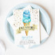 Cartão de convite de aniversário de gêmeo com tema de sorvete bonito, com ilustração aquarela de sorvetes azuis no cone de waffle. Há aspergaminhos dourados por aí. O texto na faixa diz "duas colheres são melhores que uma." Perfeito para o aniversário de um menino no verão.