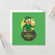 Convite com uma ilustração de um leprechaun sorridente vestindo um terno verde, uma gravata borboleta e um chapéu-coco enquanto sentado dentro de uma panela de ouro e segurando um litro de cerveja, com um arco-íris amarelo, verde e laranja ao fundo.