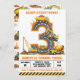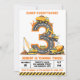 This cute construction truck 3rd birthday invitation features bright yellow dump trucks, excavators, cranes, and cement mixers forming a bold road-style number three — perfect for a construction-themed boy birthday party.