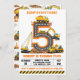 This cute construction truck 5th birthday invitation features bright yellow dump trucks, excavators, cranes, and cement mixers forming a bold road-style number five— perfect for a construction-themed boy birthday party.