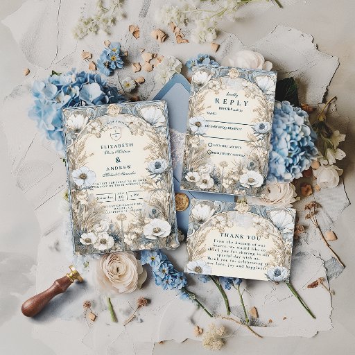 This soft dusty blue anemone design blends romantic florals with vintage botanical illustration for a timeless wedding aesthetic. The muted palette, delicate linework, and dried foliage create a serene, elegant frame around your event details. A warm cream parchment center adds a classic, heirloom quality that feels refined and sophisticated. Personalize the text to create a beautiful keepsake that reflects your celebration’s gentle, romantic style.