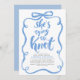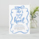 In this bridal shower invitation, a handwritten dusty blue brush lettering dances across the page with expressive strokes and playful movement, making the message "She's Tying The Knot" feel lively, modern, and full of personality. The curly soft blue bow frame pulls everything together into one bold, cohesive composition. Designed for brides who appreciate modern design with a touch of artistic flair.