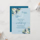 Um convite elegante para casamento com flores azuis empoeiradas e douradas brilhando e caligrafia elegante que você pode personalizar com seus detalhes.