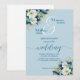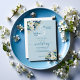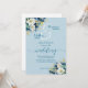 Um convite elegante para casamento com flores azuis empoeiradas e douradas brilhando e caligrafia elegante que você pode personalizar com seus detalhes.